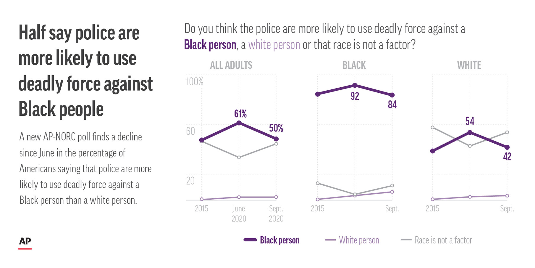 Re Americans also are less likely than they were in June to say deadly force is more commonly used against a Black person than a white person, 50% vs. 61%. The shift is pronounced among white Americans.