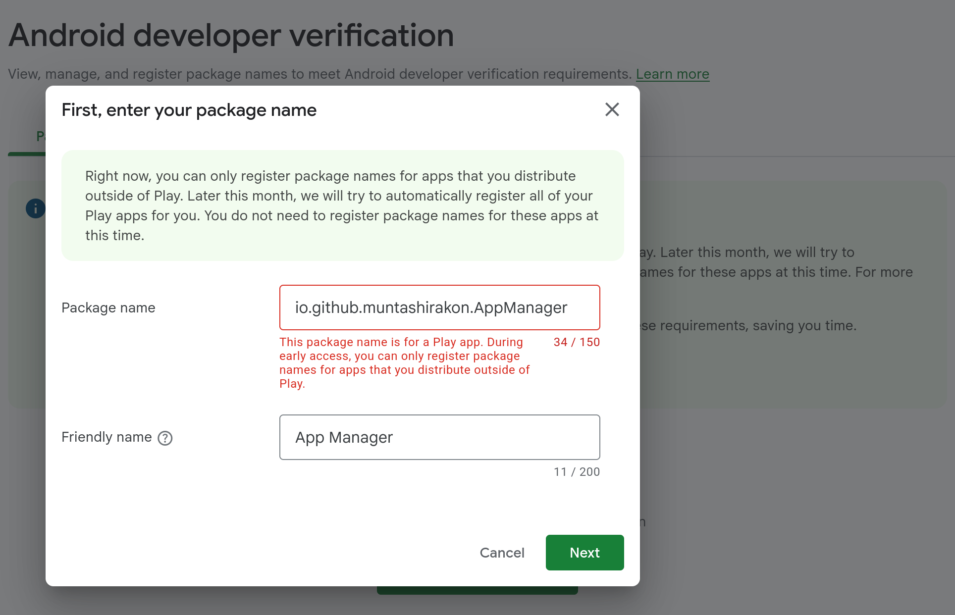It appears one or more impersonators have already registered some of the #Android applications that I maintained, including @appmanager. I've reported this to #Google, but not sure what's going to happen. The Android developer verification is still in beta, and it doesn't have a lot of features now to deal with this kind of problems.
