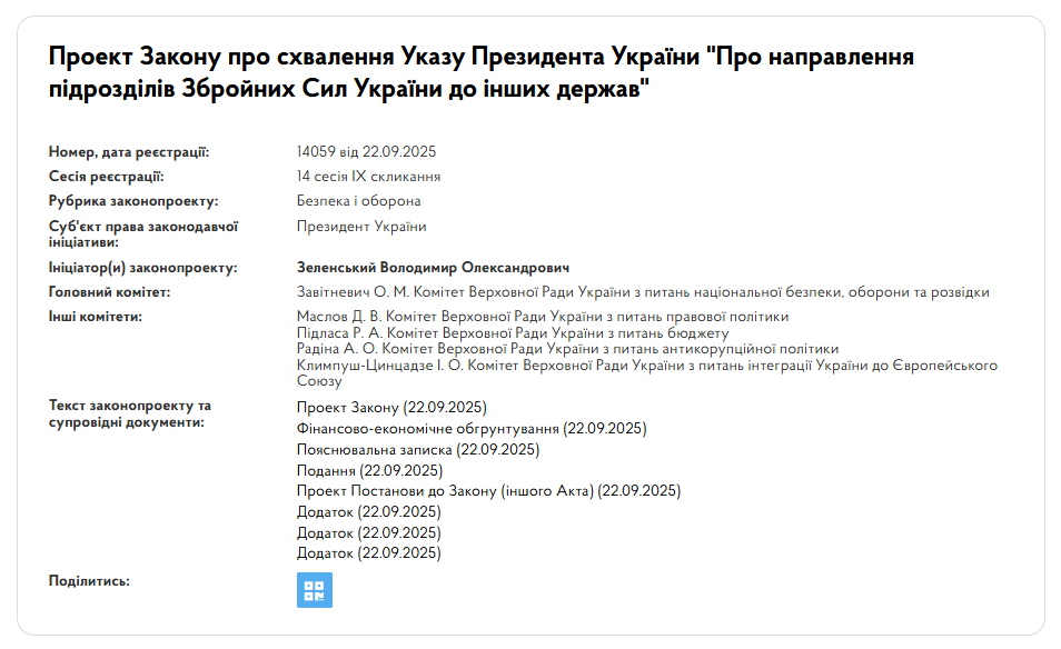 Zelensky submitted a draft law to the Rada on deploying Ukrainian Armed Forces units abroad. The proposal envisions sending naval vessels and crews to Turkey and the United Kingdom.