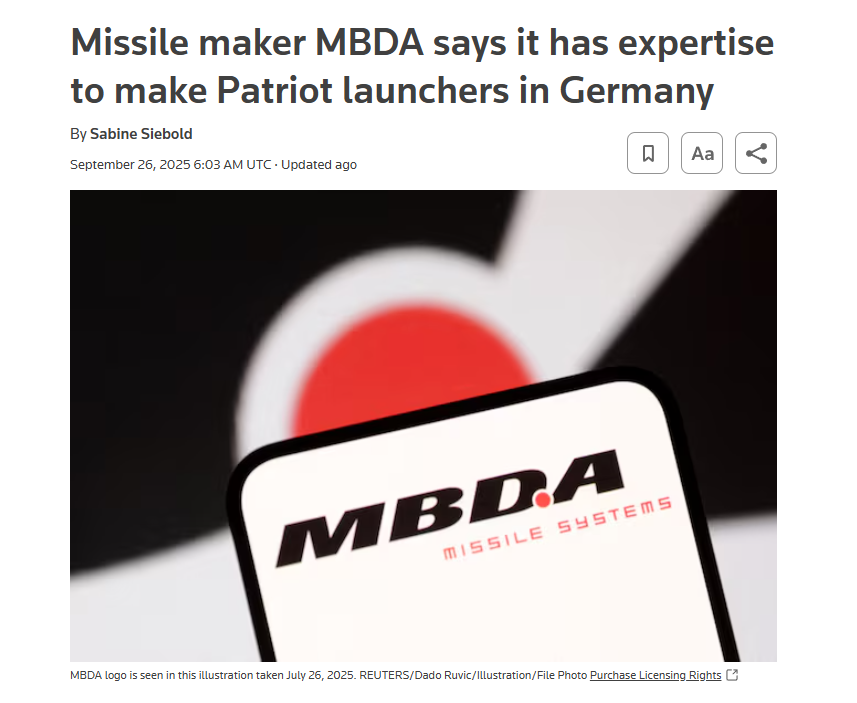 European missile maker MBDA confirmed it will begin Patriot missile production at a new plant in Bavaria by late 2026, with first deliveries in 2027. The facility will double global PAC-2 output and could expand further if demand grows. MBDA also says it has the expertise to build Patriot launchers in Germany if requested. The move follows a €5.1B deal by Germany, the Netherlands and Spain to acquire up to 1,000 Patriot missiles, marking the first Patriot production site in Europe