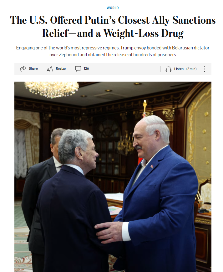 The U.S. secured the release of over 250 political prisoners from Belarus in a quiet deal involving potential sanctions relief and even weight-loss drug Zepbound, reportedly requested by Lukashenko after informal talks with Trump envoy John Coale, per WSJ.