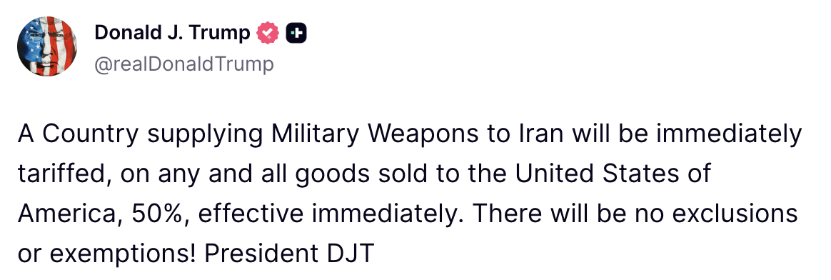 @RichRARobi @noelreports He's not saying that. He's saying that if a country supplies weapons to Iran, its exports to the US will be tariffed.