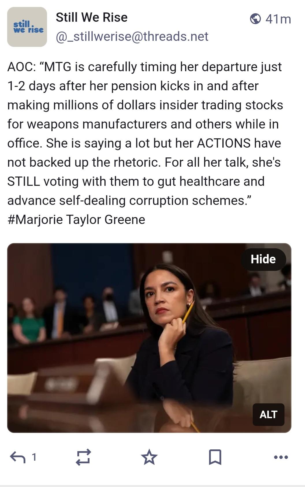 AOC: “MTG is carefully timing her departure just 1-2 days after her pension kicks in and after making millions of dollars insider trading stocks for weapons manufacturers and others while in office. She is saying a lot but her ACTIONS have