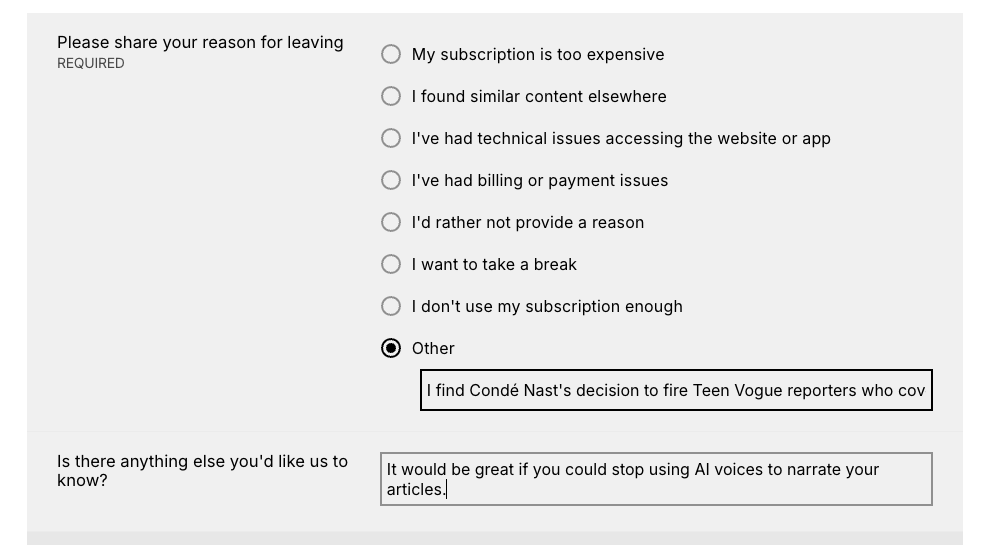 I know it's not much, but this morning I canceled my WIRED & New Yorker subscriptions (also owned by Condé Nast)... and made sure to let them know my reason. Plus I added a note about their awful AI narrations #noAI