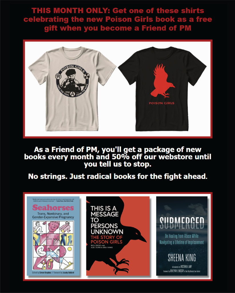 Every donation, big or small, helps us keep the shelves stocked and the stories spreading. Join us in preserving a cornerstone of progressive publishing and in building a lasting legacy for radical thought. Shop fundraiser merch: pmpress.org/index.php?l=produc