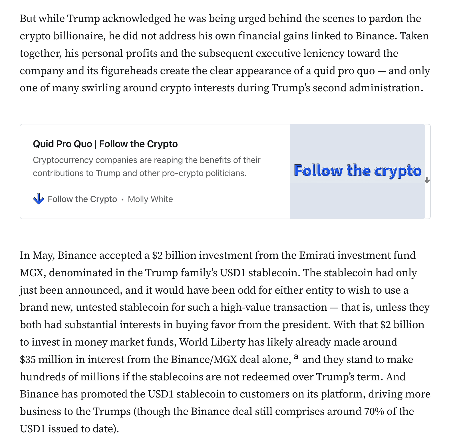 Trump admits CZ’s pardon followed lobbying efforts by CZ and Binance. He hasn’t addressed that it also followed Binance’s $2 billion stablecoin deal tied to his family’s crypto ventures, which has already produced tens of millions in profits for his USD1 token.