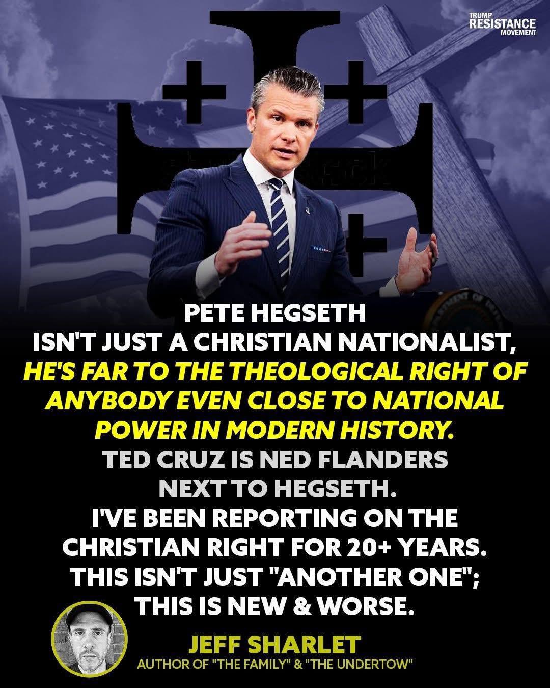 “Jeff Sharlet, a leading scholar of Christian nationalism and author of The Undertow: Scenes from a Slow Civil War, has described Pete Hegseth as a clear, self-identified Christian nationalist whose ideology is explicitly militarized and apocalyptic, not just culturally conservative. Sharlet emphasizes that Hegseth’s own writings and symbols reveal a project of holy war within the United States, not merely a defense of traditional values.” - Constitutional Crisis Alert