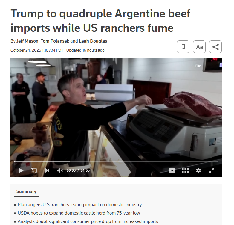 10. Lower Argentina's beef import tax rate to less than it was before you got into office, costing US farmers even more money.