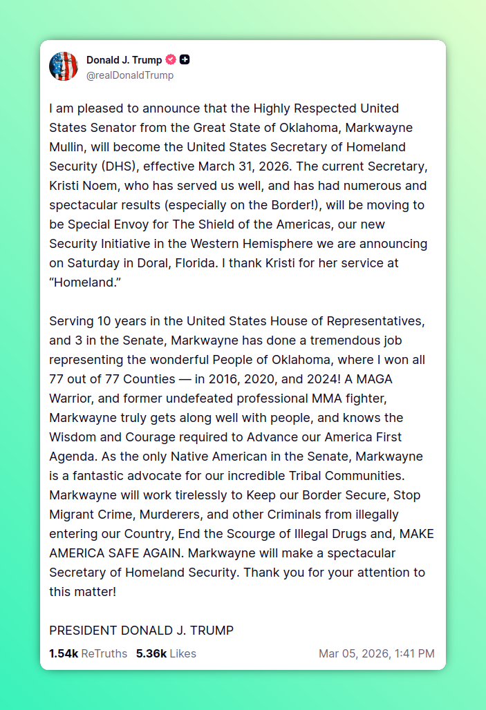 The bad news: the person our big wet president has tapped to replace her is Sen. Markwayne Mullin, who is a strong candidate for the dumbest member of the United States Senate