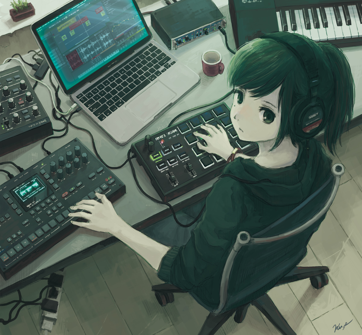 Nothing in this setup looks particularly expensive — mostly MIDI-controllers, not real synths. The controller right in front of her (?) looks like Midiplus X Pad, the soundcard is most probably RME Fireface 400, the thing on the left might be an actual synth or groovebox, it looks horribly familiar, but I can't pinpoint it. A drum machine, judging by layout, something in the vein or Korg Electribe, but it's definitely not it. The MIDI-keyboard is probably M-Audio Axiom.