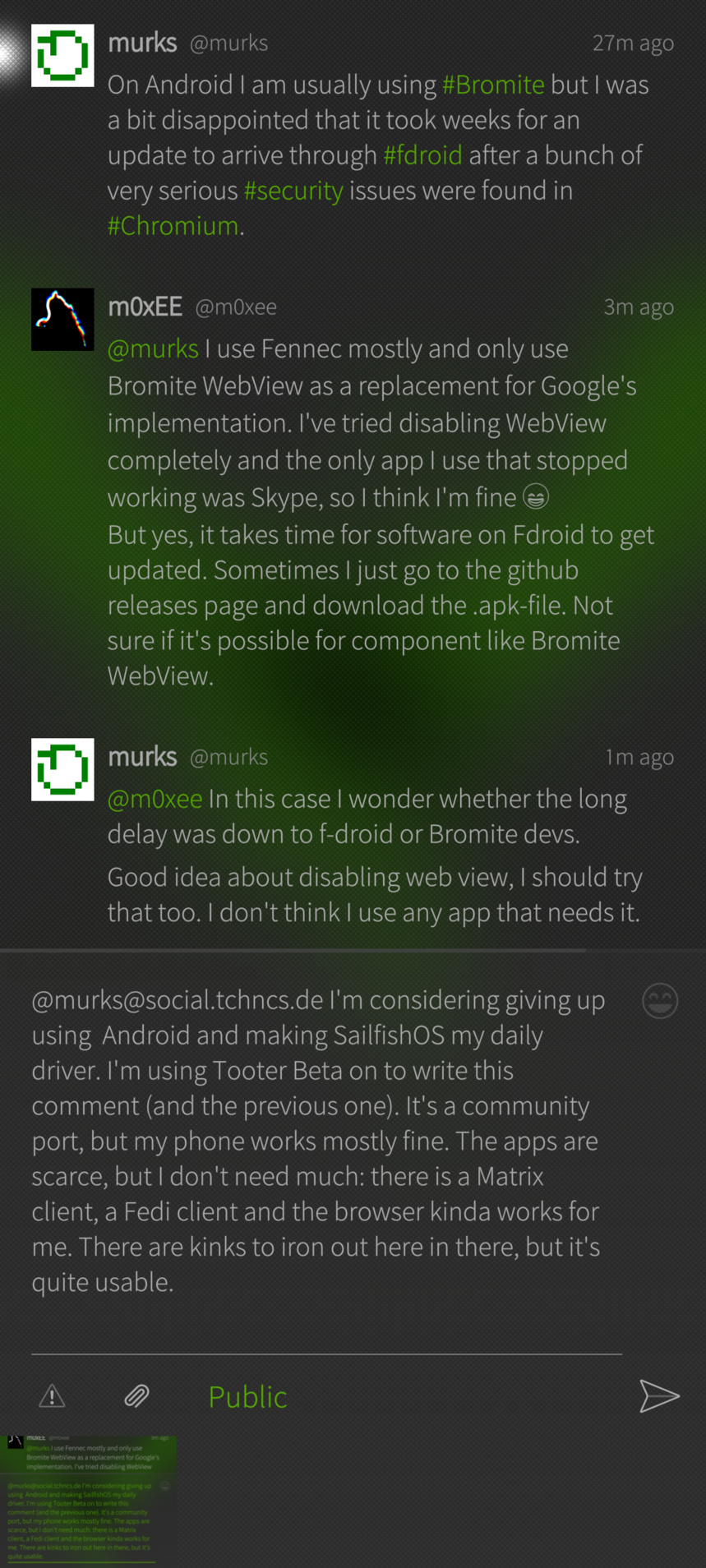 @murks I'm considering giving up using Android and making SailfishOS my daily driver. I'm using Tooter Beta on to write this comment (and the previous one). It's a community port, but my phone works mostly fine. The apps are scarce, but I don't need much: there is a Matrix client, a Fedi client and the browser kinda works for me. There are kinks to iron out here in there, but it's quite usable.