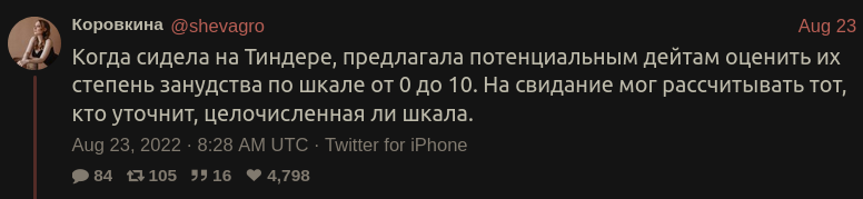 @theDoctor@fosstodon.org Let me translate this for you: "When I was using dating apps I asked the candidates to rate their meticulousness on a scale 0 to 10 and went out with the ones who asked if the scale was discrete or continuous".
