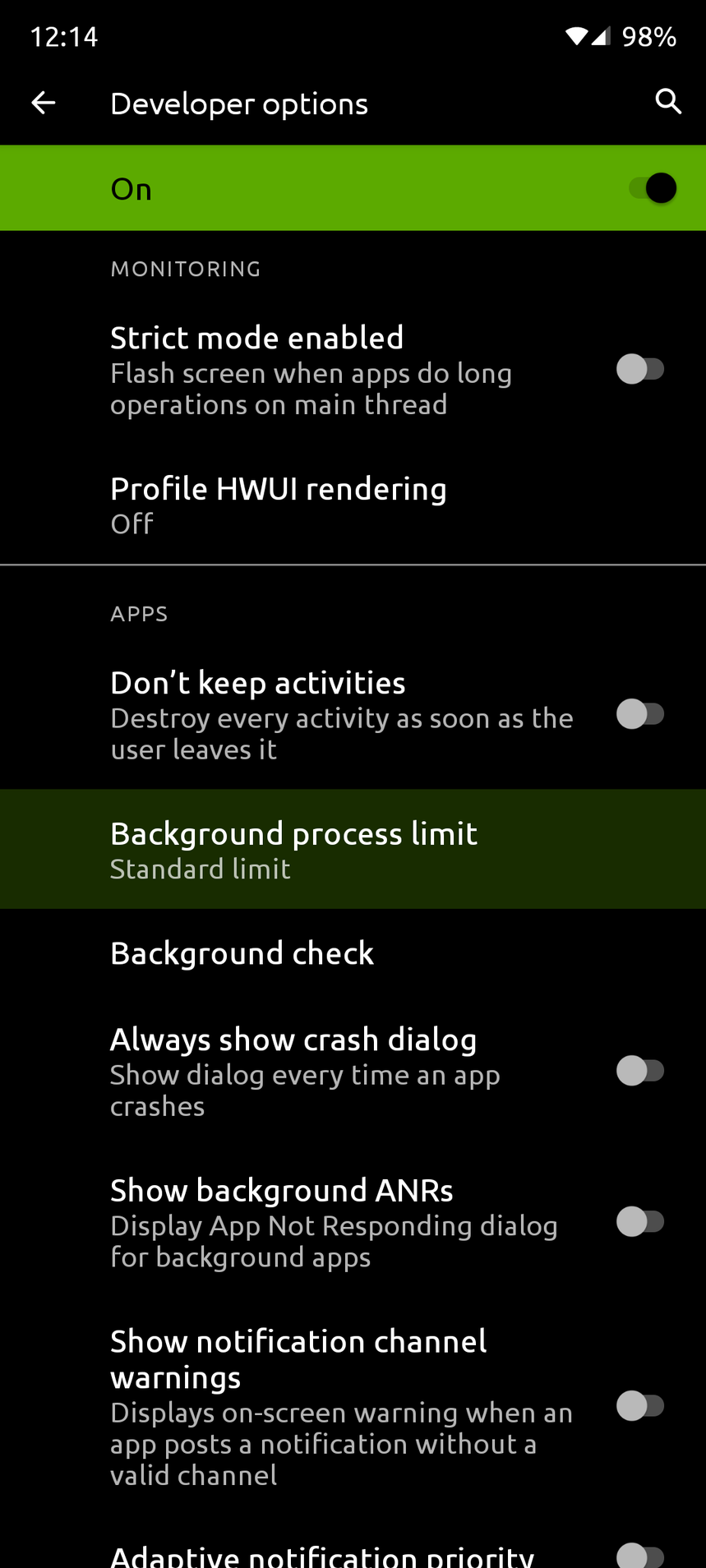На втором ещё параметр ограничения количества фондовых процессов из настроек разработчика, можно попробовать и его изменить.