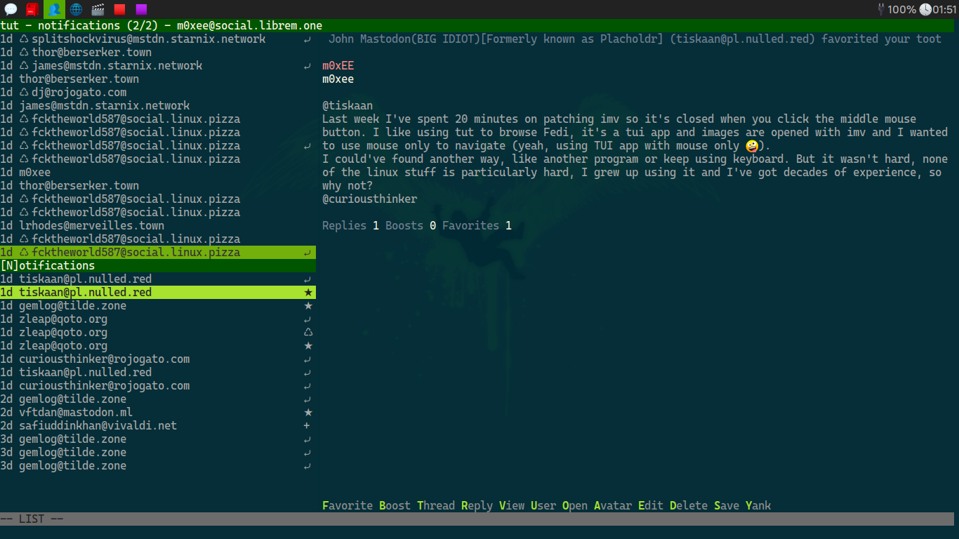 Last week I've spent 20 minutes on patching imv so it's closed when you click the middle mouse button. I like using tut to browse Fedi, it's a tui app and images are opened with imv and I wanted to use mouse only to navigate (yeah, using TUI app with mouse only 🤪).