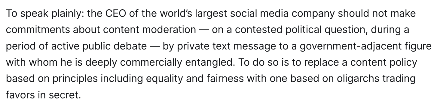 I wrote about Zuckerberg's texts with Musk and how they undermine the principles of a fair and equal platform for everyone https://www.platformer.news/zuckerberg-musk-texts-trial-content-moderation/