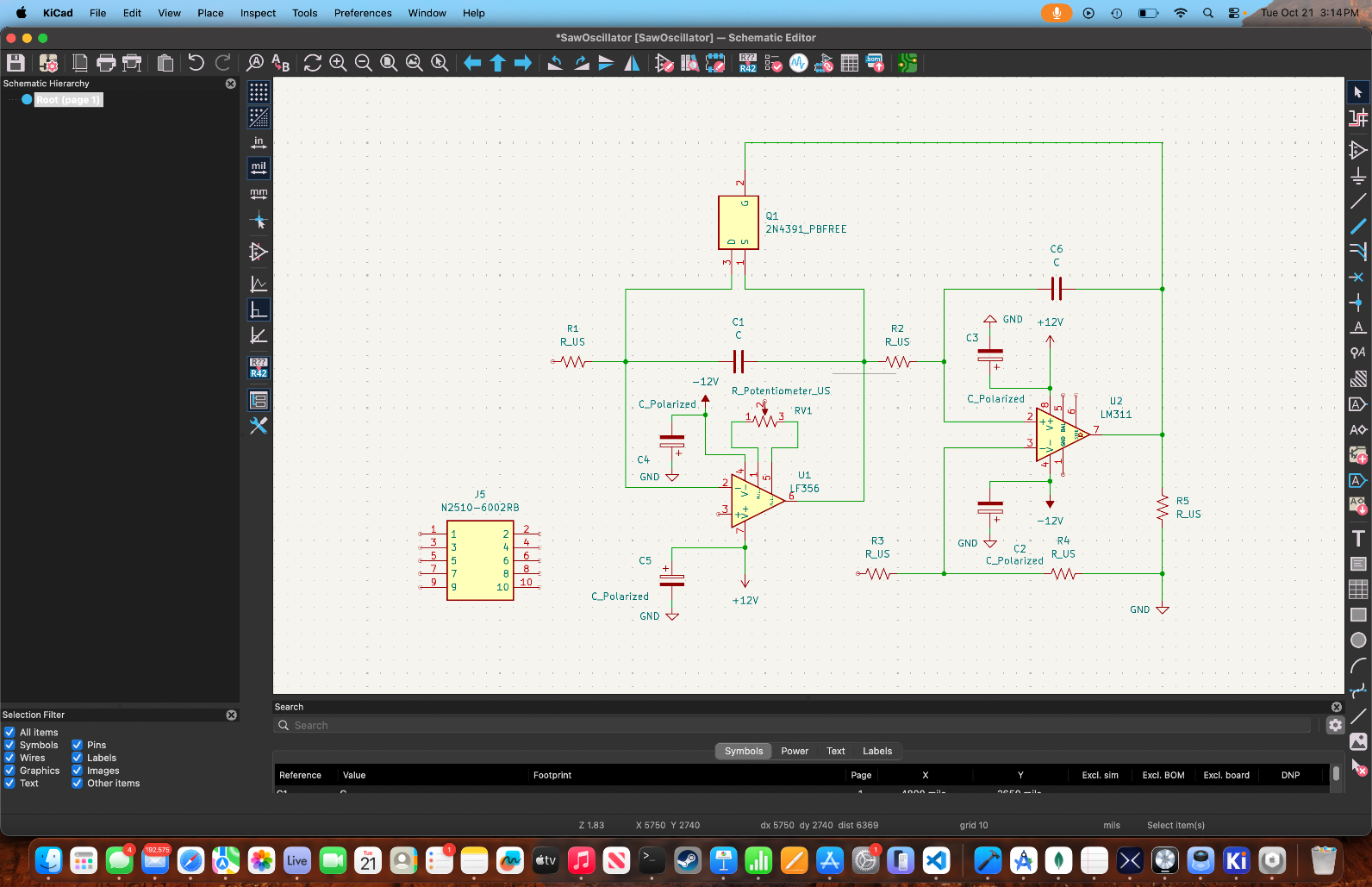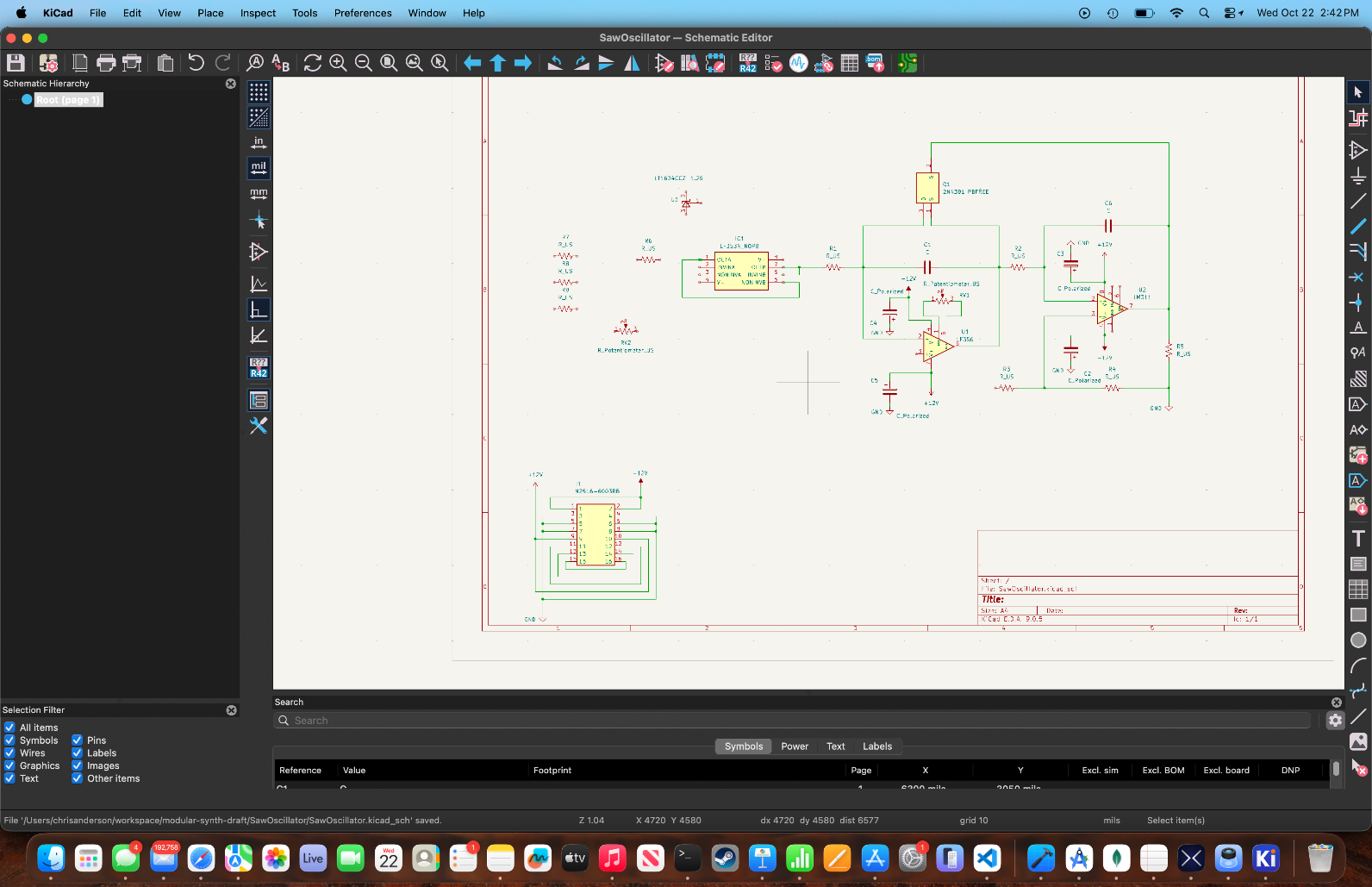 Making my way through the synth oscillator design (Sawtooth)....adding parts to the KiCAD schematic editor and figuring out how to accommodate Euroack's connector and CV standards. The last time I got into a hardware synth project, there was no Eurorack standard.....I like it though and I already have a good testbed for an oscillator.