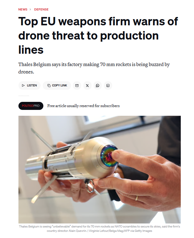 Thales Belgium, one of Europe’s main weapons producers, warns its rocket factories are increasingly being overflown by drones, including near its explosive assembly site in Liège.