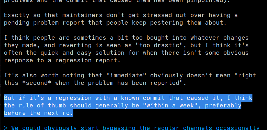 That's about the time in which Linus wants #Linux #kernel regression fixed users reported. Through a revert if necessary, ""so that maintainers don't get stressed out over having a pending problem report that people keep pestering them about.""